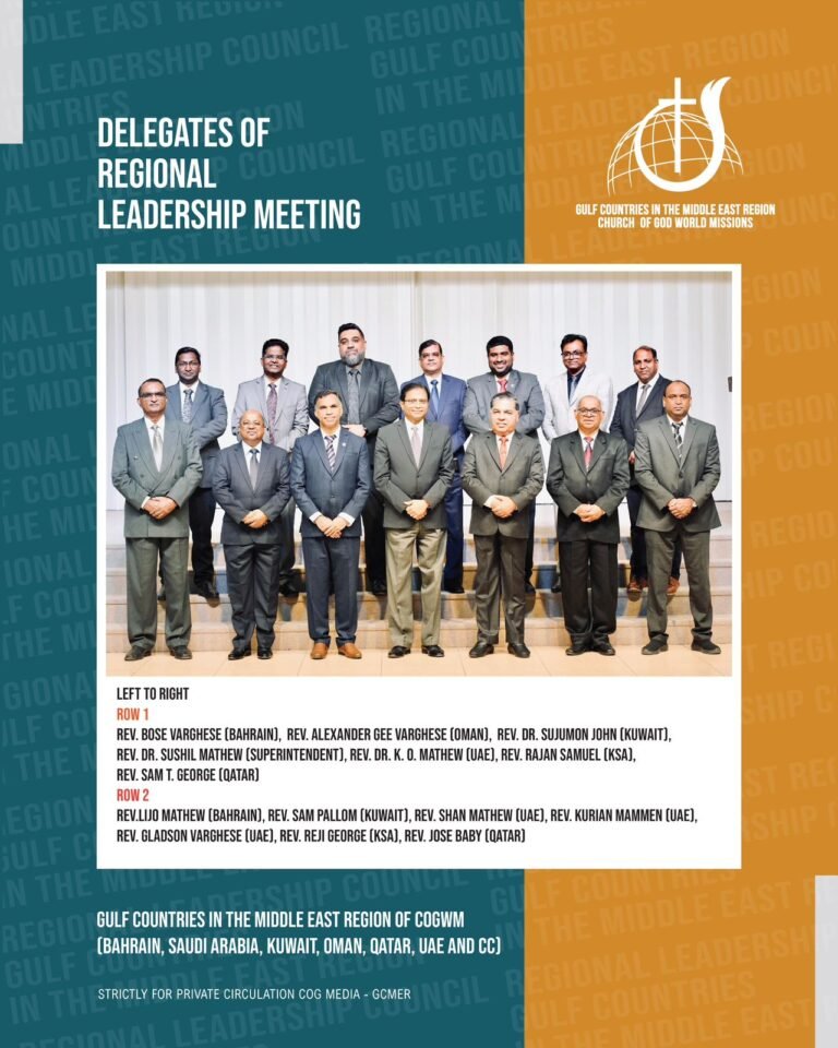 The National Overseers and their representatives of The Church of God (COG) in the Gulf countries of the Middle East for the very first time met in UAE under the leadership of the newly appointed regional superintendent Dr. Sushil Mathew. The two day “Regional Leadership Council Meeting” was organised and hosted by Dr. K. O. Mathew, the National Overseer of UAE at the Sharjah Worship Center in UAE.
